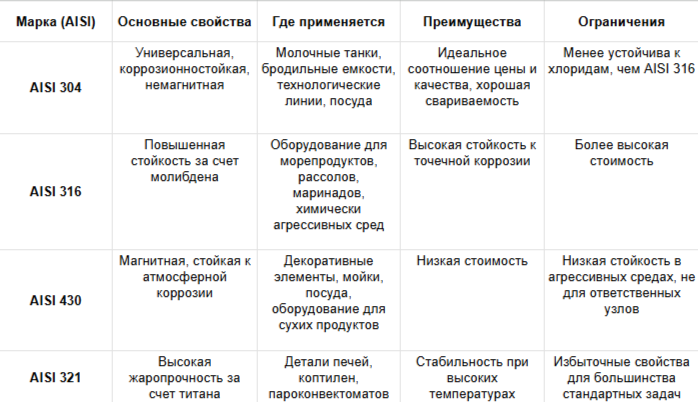 • Пищевая промышленность: AISI 304 (08Х18Н10) — для большинства задач. AISI 316 — для агрессивных сред (рассолы, уксус).