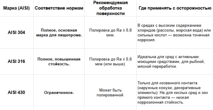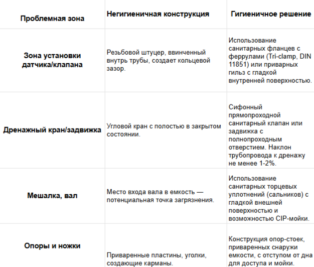 Недопустимые решения:- Накладные соединения на заклепках или винтах в зоне прямого контакта с продуктом.